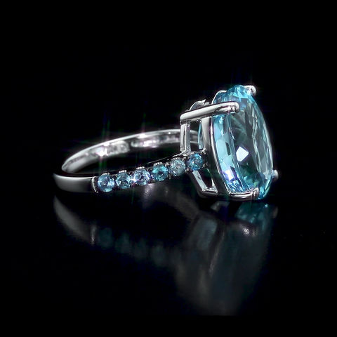 Get yourself a style uplift with this feminine London Blue Topaz and Diamond Oval Ring. Crafted in lustrous sterling silver, this ring showcases one oval-cut sky-blue topaz gemstone (14 x 12mm) placed at the center and twelve round-cut, buttercup-set, London Blue Topaz gemstones (G-H, I2,I3) studded on the shank. With a high polished finish, this ring will be your go to number for any event. A must have in any jewelry collection.