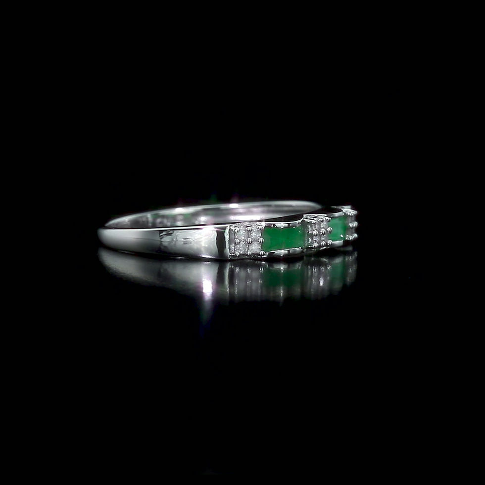 Minimalistic, simple and stylish, this Emerald and Diamond Accent AnniversaryBand with its captivating design adds to your chic quotient. Crafted in white gold, this classic ring features three baguette-cut, half bezel-set emerald gemstones (4x2mm) with sixteen round-cut, prong-set diamonds (G-H-I, I2-I3) along the sides of the band. Buffed to perfection, this ring is an ideal choice to be worn on an everyday basis. White gold will always be a trendy choice and loved by women of all ages.