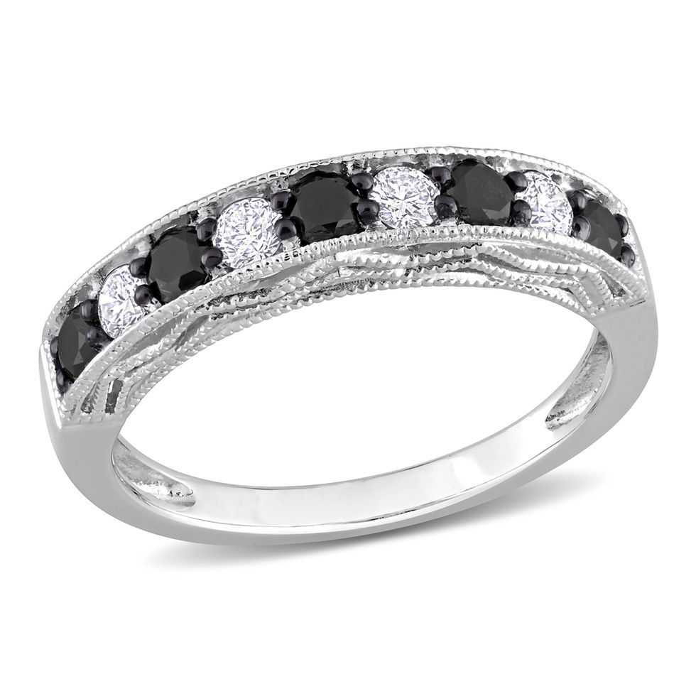 Make her feel like a queen on the big day with this opulent Diamond Semi-Eternity Anniversary Band. Crafted in lustrous sterling silver, this elegant ring features five round-cut, pave-set black diamonds and four round-cut, pave-set diamonds (G-H-I, I2-I3) with milgrain detail. Enhanced with a high polished finish, this vintage style ring is perfect to celebrate your everlasting love.