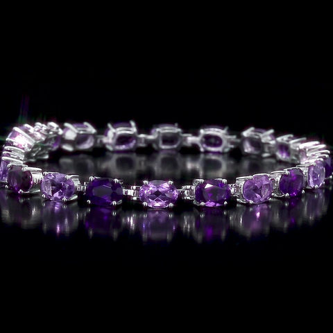 Add a feminine touch to your evening look with this stylish African Amethyst and Oval-Cut Rose de France Tennis Bracelet. Crafted in lustrous sterling silver, this charming bracelet showcases 10 oval-cut, prong set, African amethyst gemstones (7x5mm) and 10 oval-cut, prong set, rose de France gemstones (7x5mm). Enhanced with a high polish finish, this splendid 7.25-inch bracelet is comfortably secured with a box clasp. A timeless accessory that will always keep you in trend.