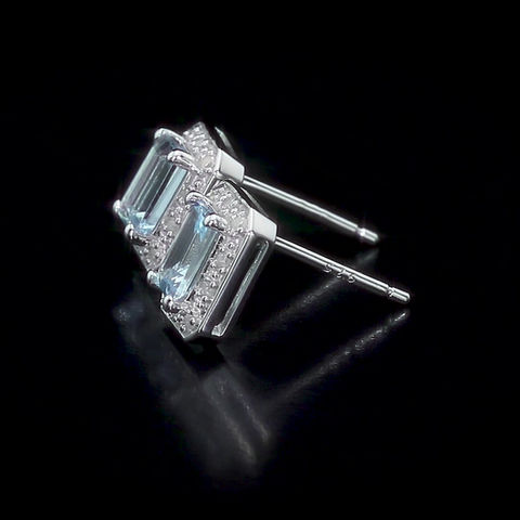 Shower some self love with these sophisticated Aquamarine and Diamond Solitaire Post Earrings. Crafted in lustrous white gold, these gorgeous earrings feature two prong set, emerald cut aquamarine (6x4mm) gemstones decorated with 20 prong set, pave set round cut diamonds (H I-J, I3) in a halo design. Enhanced with a polished finish, these splendid earrings are secured with butterfly closures. Coordinate with a matching pendant for a flawless look.