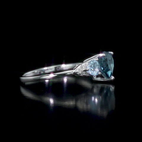 This stunning 3-Stone Ring is a unique accessory. Crafted in lustrous sterling silver, this elegant ring features a central heart-cut prong-set London blue topaz gemstone (7x7mm) bordered by two heart-cut prong-set sky blue topaz gemstones (4x4mm) and six round-cut pave-set diamonds (H-I, I3). Enhanced with a polished finish, this gorgeous ring is worth treasuring. Melt her heart by surprising her with this beautiful ring.